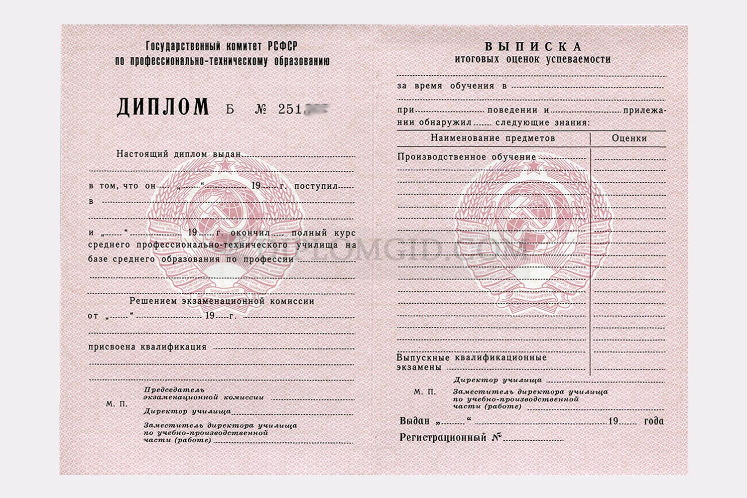 Диплом ПТУ о среднем образовании 2014-2025 года. Комплект: диплом, обложка, приложение. Качество: Гознак